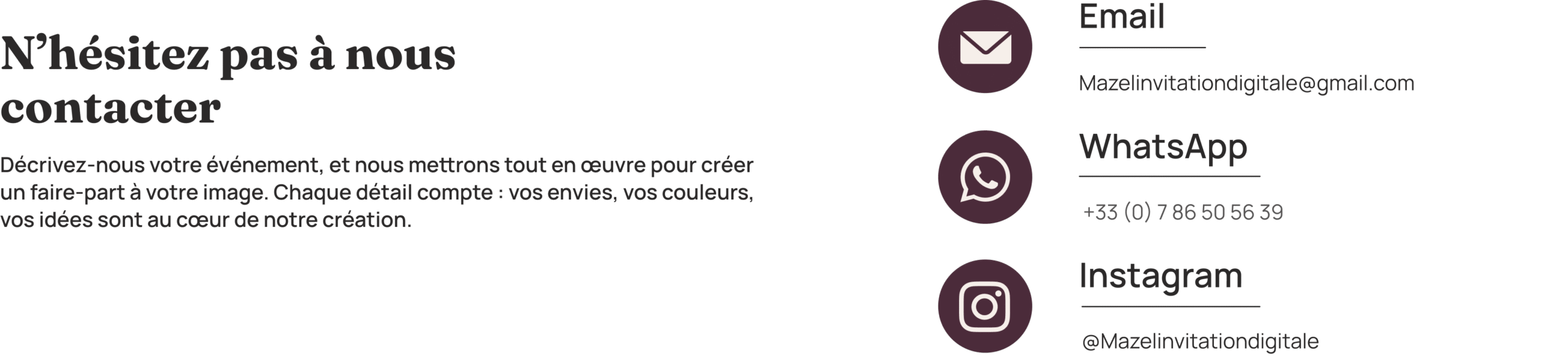 Décrivez-nous votre événement, et nous mettrons tout en œuvre pour créer un faire-part à votre image. Chaque détail compte : vos envies, vos couleurs, vos idées sont au cœur de notre création.